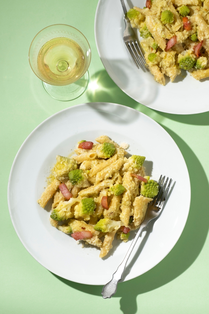 Πένες ρομανέσκο Κόβουμε το ρομανέσκο σε τούφες και τις σοτάρουμε σε ένα τηγάνι που έχουμε περάσει πρώτα το ψιλοκομμένο μπέικον. Συμπληρώνουμε με μία κουταλιά της σούπας εξαιρετικό παρθένο ελαιόλαδο και προσθέτουμε τις πένες που έχουμε βράσει σε άλλη κατσαρόλα. Προσθέτουμε τριμμένη παρμεζάνα και στο σερβίρισμα ολοκληρώνουμε με φρεσκοτριμμένο πιπέρι.
