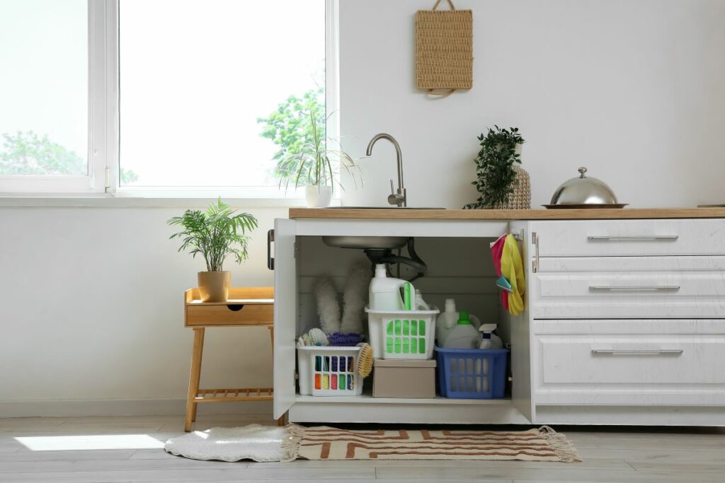 Το ντουλάπι του νεροχύτη μπορεί να αξιοποιηθεί σωστά αν χρησιμοποιείται για αντικείμενα ανθεκτικά στην υγρασία. Σφουγγάρια, γάντια καθαρισμού, σακούλες απορριμμάτων ή πλαστικά δοχεία αποθήκευσης είναι οι πιο ασφαλείς επιλογές, ειδικά όταν φυλάσσονται μέσα σε κλειστά κουτιά αποθήκευσης. Το ντουλάπι αυτό μπορεί να χρησιμοποιηθεί επίσης για να στεγάσει την ανακύκλωση στο σπίτι μας, αρκεί να χρησιμοποιούμε πλαστικά δοχεία αποθήκευσης όπου διαχωρίζουμε τα απορρίμματά μας. Χρήσιμο είναι επίσης να χρησιμοποιούνται πλαστικά κουτιά ή δίσκοι που συγκρατούν τυχόν νερά σε περίπτωση μικρής διαρροής, προστατεύοντας τόσο τα αντικείμενα όσο και το ίδιο το ντουλάπι.