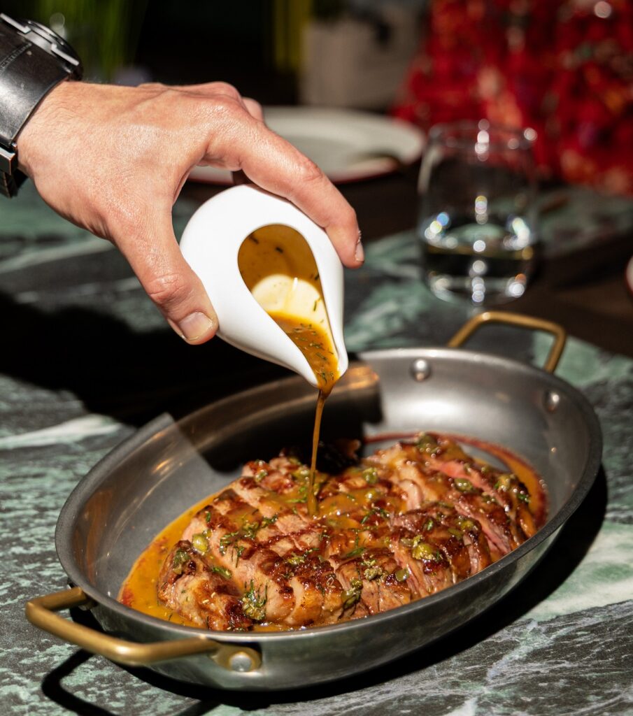 Τέλος, ήταν η σειρά και για δύο πιο μπαμπάτσικα κυρίως. Πολύ comfort επιλογές. Παέγια αλλιώς, με παπαρδέλες. Σαλάμι chorizo, μπουκιές κοτόπουλου, καπνιστά μύδια, φρέσκες γαρίδες, πιπεριές piquillo. Ένα πλούσιο πιάτο, με πολλές γεύσεις που ισορροπούσαν μεταξύ τους, με το γευστικό αποτέλεσμα να δικαιώνει τον τίτλο του πιάτο. Και για τον επίλογο των αλμυρών, ο σεφ μάς έφερε στο τραπέζι ένα ζουμερό και ψημένο με τους χυμούς του μοσχαρίσιο rib eyre. Σερβιρίστηκε με δεμένη και αρωματική σάλτσα βουτύρου café de Paris και απλά, αλλά καθόλου απλοϊκά, τραγανά τσιπς πατάτας.