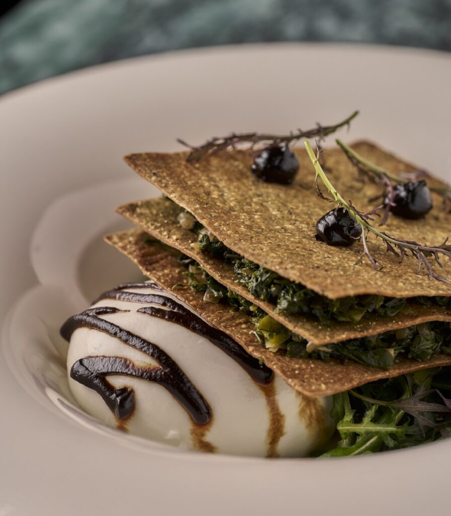 Από σαλάτες, δοκιμάσαμε την ελληνική μπουράτα, με τις ωραίες υφές. Ποιοτική burrata από βουβαλίσιο γάλα, τσιγαριαστά χόρτα, μαύρο σκόρδο, τραγανό φύλλο, πάντρευαν την εμπειριά της κλασικής ιταλικής σαλάτας, με μια διαφορετική μα εξίζου νόστιμη χορτόπιτα.